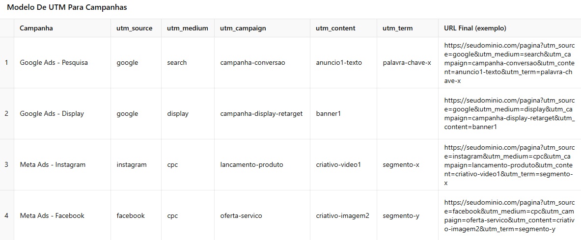 Aqui está a tabela com exemplos práticos de estrutura de UTM para campanhas no Google Ads e Meta Ads. Ela pode ser usada como base para criar, rastrear e comparar o desempenho de diferentes canais, criativos e campanhas. ⬇️